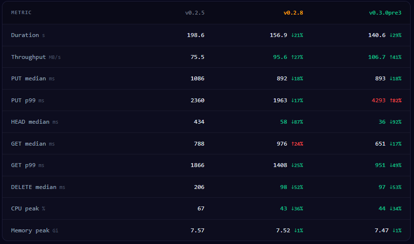 Compared to v0.2.5. throughput and HEAD median has improved greatly by 41% and 92% respectively. The integration with Rust has improved the GET median by 17%. The PUT p99 showed regression possibly due to some I/O issues during the test - this will be monitored. Overall, the performance is faster now on v0.3.0.